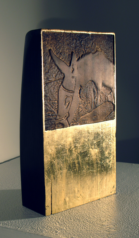 Carved and burnt basswood, gold leaf, wax; 11"x5"x3"