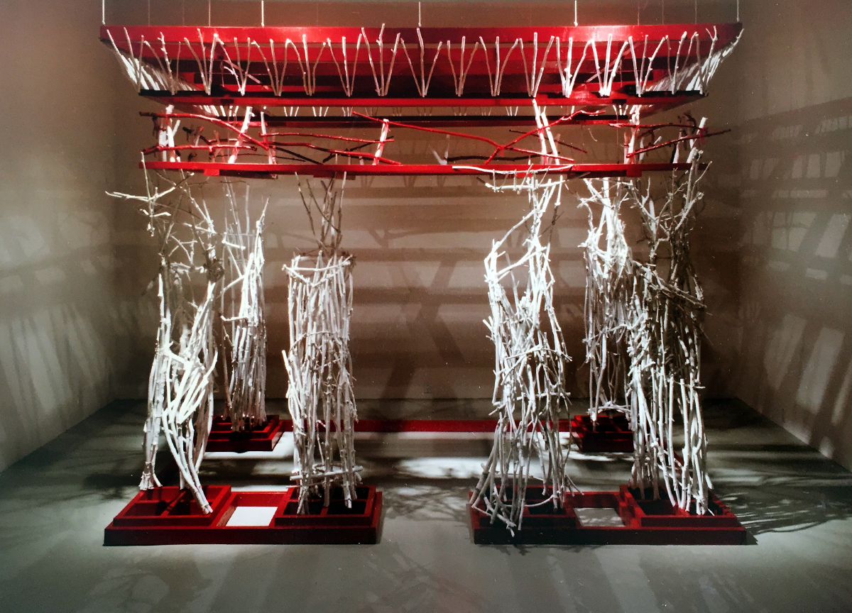 Based on the porch of the Caryatids of Erechtheon on the Acropolis in Athens, Greece, six figures, each over 6' high are constructed of sticks, painted white with gesso. One of them is a study of the contraposto stance of the original Caryatids. The other five are loosely based on personifications of different goddesses or strong women from mythology. (Artemis, Leto, Aphrodite, Hippolyte, Daphne). These figures stand on a framework of 2" x 4"'s painted enamel red. Suspended from the ceiling is a tier of red boards and sticks to suggest the form and weight of the entablature the original caryatids bore.