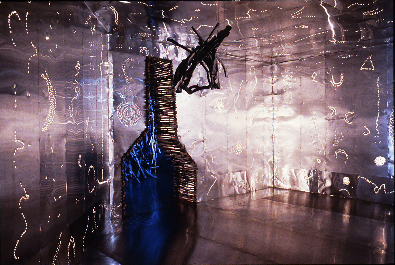 Portage 1986 installation: Minneapolis Institute of Art, Minneapolis, MN variable size: two rooms perforated aluminium sheeting, Christmas lights, wood, wire, rope, audio of recordings From San Onufre Nuclear plant, southern California