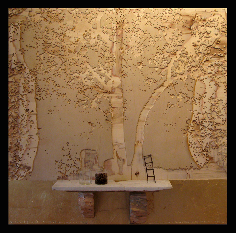 Carved birch ply, gold leaf, marble, glass, found rusted steel ladder