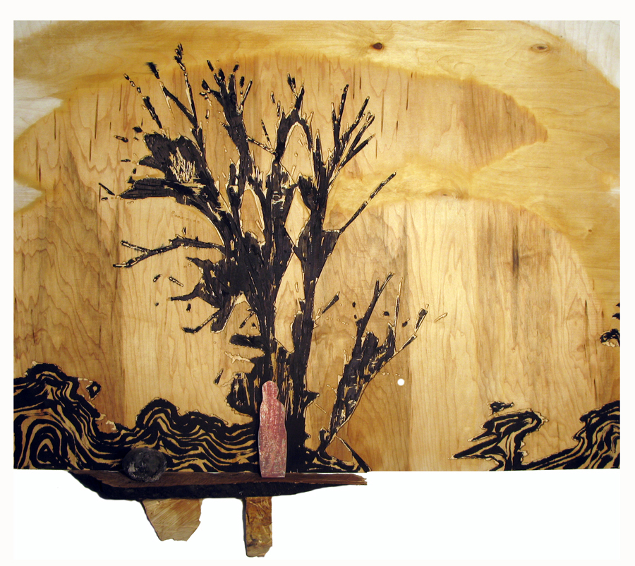 Carved apple ply, India ink, chalk, burnt bedpost, oil pastel, wax; 28”x 38” x 5”