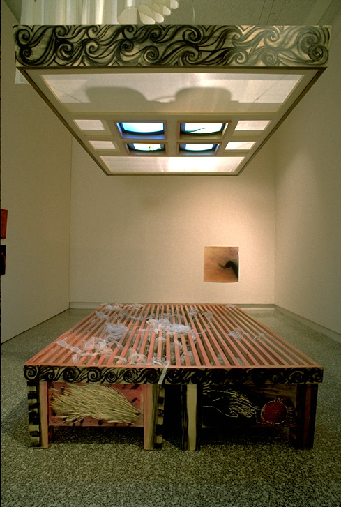 carved and painted wood, 50 pounds of lavender, 4 videos, 4 monitors and decks. area dimension: 12'x 12' x 30'; lower bed dimension: 16" x 56" x78"
