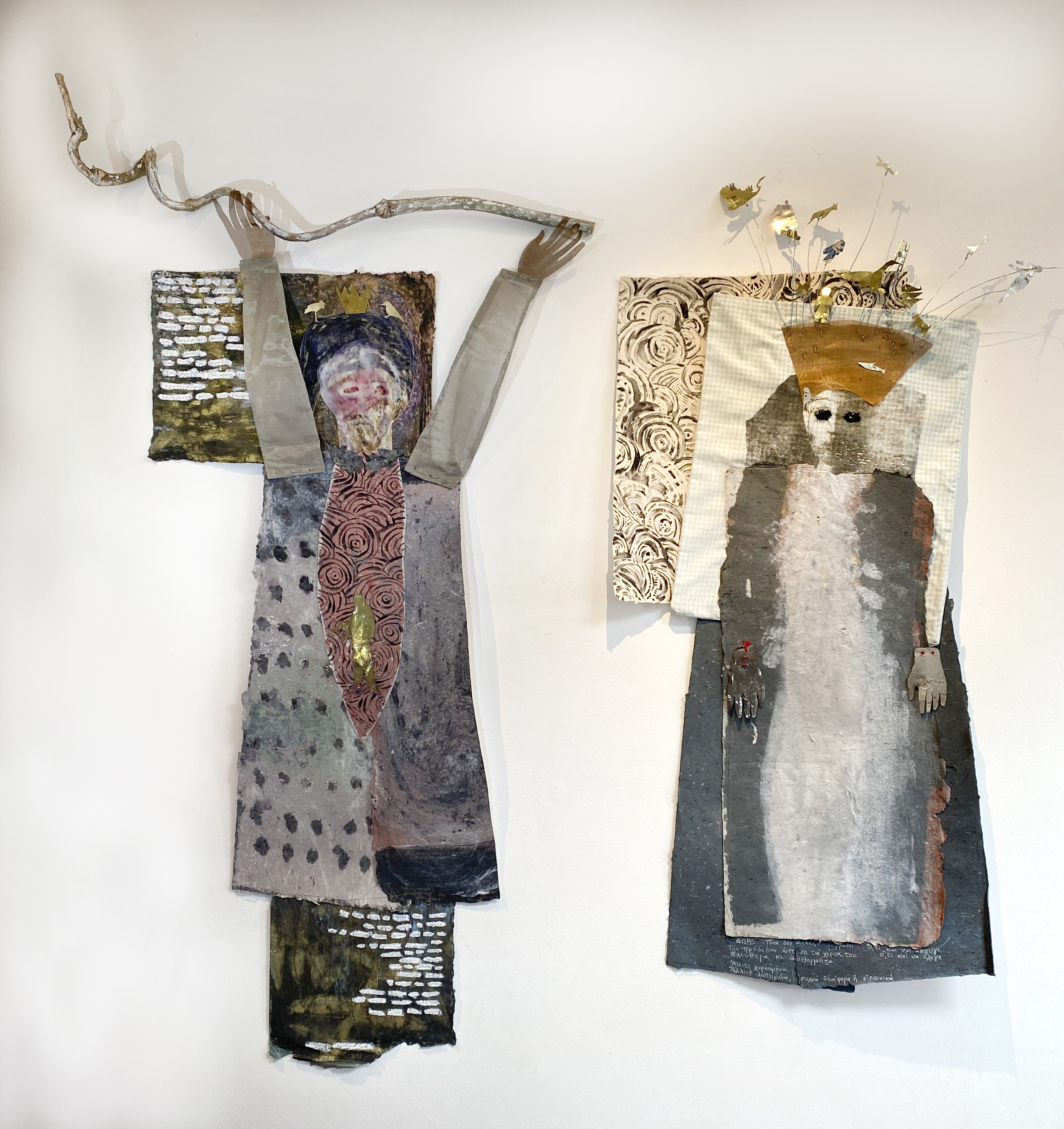 handmade paper , metallic elements (brass and copper sheet, copper wire mesh, tin cans, wire), thread, oil pastel, ink, fabric, seed beads, wooden vine.