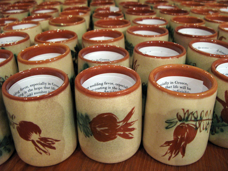 with Niko Lembesis wedding koufeta (favors) 2007 earthenware, slip, sgrafitto, 3" high set of 200, each unique
